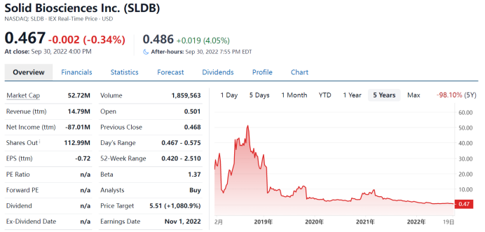 2012年,Ganot在儿子被诊断出患有杜氏肌营养不良症后,辞去伦敦华尔街银行家的工作,创办了 Solid 。上市之前筹集了近 1.5 亿美元来推动Solid发展,2018 年 1 月Solid以每股 18 美元的价格IPO上市,融资1.25亿美元。但是随后该公司在DMD基因疗法开发过程中遭遇一系列挫折后股价暴跌。
