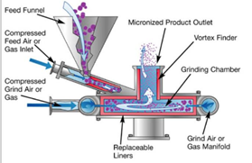 气流粉碎是将净化和干燥的压缩空气通过一定形状的特制喷嘴,形成高速气流,以巨大的动能将带动物料在密闭的粉碎腔体中互相碰撞而产生剧烈的粉碎作用,所需的粒径大小可以通过调节进料压力和粉碎压力、下料速度进行有效控制。经气流粉碎的原料平均粒径小,粉碎粒径范围一般在0.5-20μm,粒度分布窄;且由于压缩空气在喷嘴处绝热膨胀会使系统温度降低,颗粒的粉碎是在低温瞬间完成,尤其适用于低熔点、热敏性原料的粉碎。![]()
