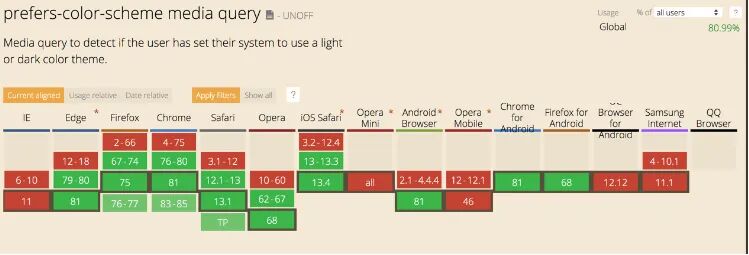 注意:prefers-color-scheme 在 W3C 规范上处于 level5 的草案,在生产环境还需要针对不同浏览器做一些向下兼容处理。