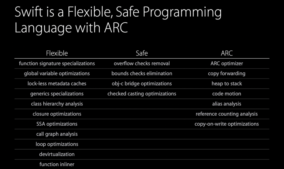 Swift 语言的核心就在于 SIL,前文中描述过 SIL 的功能了,究其根本就是分析和高级优化。这些优化可以归纳为下图中诸多方面。本节以性能优化为主,对其中部分优化展开阐述。