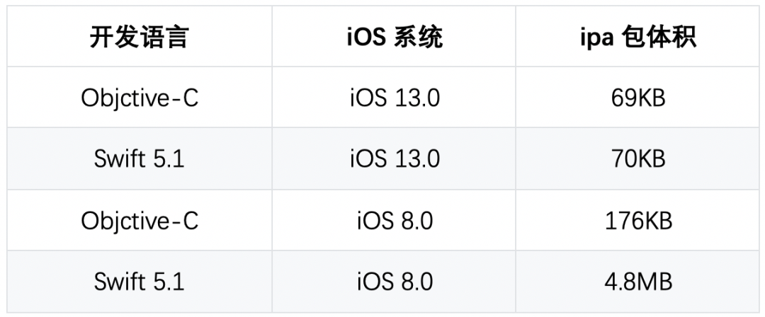 在 Swift5.0 之前,或者在低于 iOS 12.2 以下的操作系统中 Swift runtime 和标准库包仍然会打包到工程的包中,仍然占用和应用的包体积。