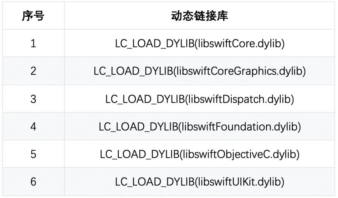 根据可执行文件分析,得到新增的 Swift 相关动态链接库: