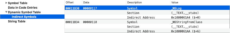 3. 通过间接符号表中存的index 找到符号表中对应符号的位置,再从符号表中存的字符表位置在字符表中找到对应字符