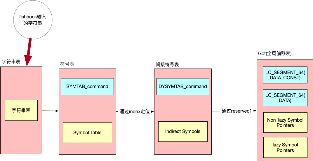 通过上面动态链接的过程发现绑定流程是: got--->indirect间接符号表--->符号表,那要改got里的指针肯定是反向查找,从符号表开始:符号表--->indirect间接符号表--->got, 所以fishhook也一定是走的这个流程,既然fishhook的切入点是一个字符串,那么从一个字符串到符号表,这中间一定有一个联系方式。其实符号表中存有符号在字符串表中的起始位置,那这个时候我们的查找链就诞生了,也就是:String Table--->符号表--->indirect间接符号表--->got表。