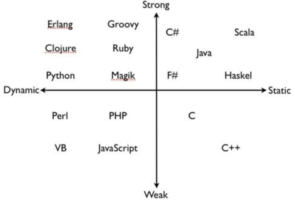 随着时间流逝,动态语言加入了静态能力,静态语言加入了动态能力,静态和动态正在相互靠拢,未来的编程语言属于这两者的杂交产物。Kotlin作为JVM语言,它落在第一象限,动态性比Java强,类型强度比Java弱。
