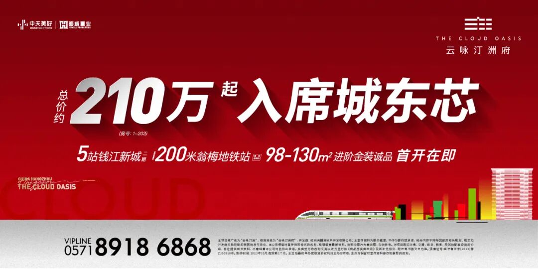 在5站钱江新城2.0的位置上,总价210万起的云咏汀洲府,目前售楼处、样板间已经开放,首开1#、2#正在登记中,预算充足的小伙伴千万别错过。