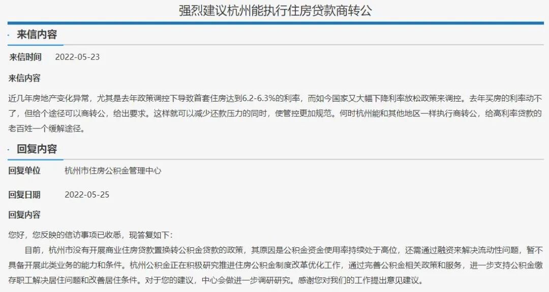 对于大众的呼声,杭州市住房公积金管理中心已经给出了回应:杭州住房公积金管理中心目前没有将商业住房贷款置换为公积金贷款的业务,其原因是公积金资金使用率持续处于高位,还需通过融资来解决流动性问题,暂不具备开展此类业务的能力和条件。杭州公积金中心在年度报告中提到,2021年资金运用率高达94.5%,其中80%的支出与住房有关。