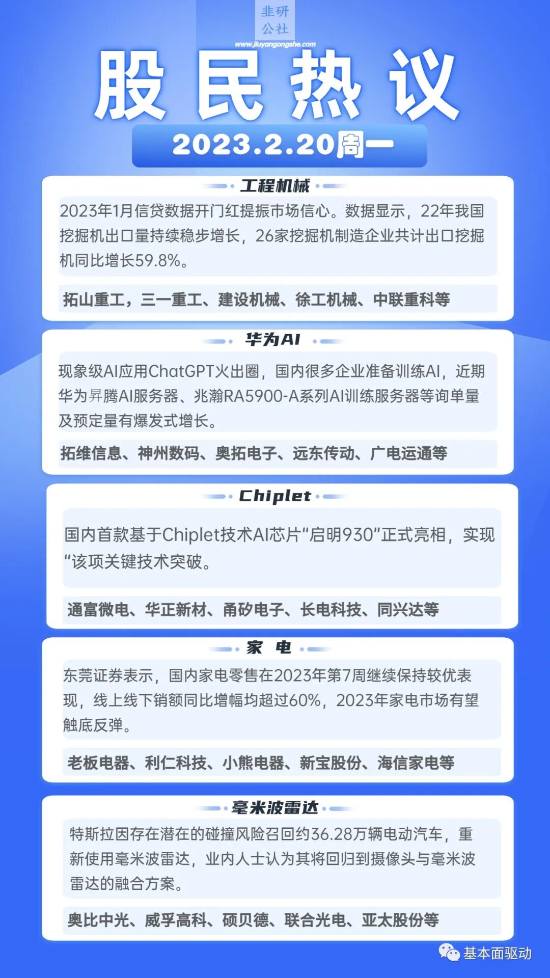 1、工程机械:2023年1月信贷数据开门红提振市场信心。数据显示,22年我国挖掘机出口量持续稳步增长,26家挖掘机制造企业共计出口挖掘机同比增长59.8%。(拓山重工,三一重工、建设机械、徐工机械、中联重科等)2、华为AI:现象级AI应用ChatGPT火出圈,国内很多企业准备训练AI,近期华为昇腾AI服务器、兆瀚RA5900-A系列AI训练服务器等询单量及预定量有爆发式增长。(拓维信息、神州数码、奥拓电子、远东传动、广电运通等)3、Chiplet:国内首款基于Chiplet技术AI芯片“启明930”正式亮相,实现“该项关键技术突破。(通富微电、华正新材、甬矽电子、长电科技、同兴达等)4、家电:东莞证券表示,国内家电零售在2023年第7周继续保持较优表现,线上线下销额同比增幅均超过60%,2023年家电市场有望触底反弹。(老板电器、利仁科技、小熊电器、新宝股份、海信家电等)5、毫米波雷达:特斯拉因存在潜在的碰撞风险召回约36.28万辆电动汽车,重新使用毫米波雷达,业内人士认为其将回归到摄像头与毫米波雷达的融合方案。(奥比中光、威孚高科、硕贝德、联合光电、亚太股份等)