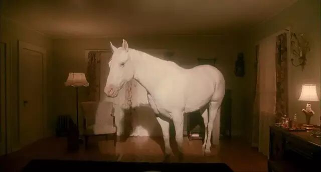 面露惊讶的孩子——在铺有铁轨的马路上,看到有一匹脱缰的马在追着一列风驰电掣的电车,他嘴角的白色唾沫干涸了,母亲们的大叫伴着嘲弄的语气——对存在者的可能的爆发具有了不可磨灭的印象。这副画面明显是有深意的。孩子无法沉浸于人们强加给他的有效性与有条理的行动的世界之中。但是,蹄子的碰撞声会不断地在其颤抖中向舞台后边的人宣告着非-意义的晦暗的可能性。这种动物的可能性并非是带有任何有利评论的对象,它们也没有被揭示为一种危险:因为脱缰野兽的转瞬即逝的那一面位于人类限度的彼岸。这种无限度的倾泻毋宁说属于梦的领域:它定义了一种神圣的可能性。在最遥远的时代,神难道没有把动物神话同人类尺度对立起来吗?它的本质就是神圣的、可怕的、不可把握的存在:一种悲剧性的慷慨为它奠基,这慷慨挑衅着,并将一切引向死亡,它超越了本质。只有暴风雨的威严和马的绝对的疯狂拥有这种耗尽光、闪电、无度的散失的能力。《双峰:与火同行》里出现在房间里的马。