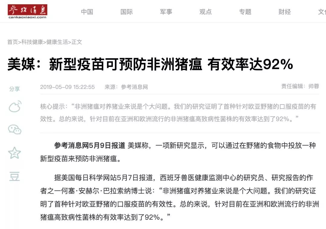 链接:美国某研究称新疫苗可预防非洲猪瘟 有效率达92%