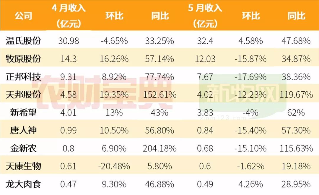 从销售收入上来看,温氏股份由于5月份销量和均价都上涨,销售收入仍然有47.68%的增长。正邦科技的销量虽然下降比较大,但销售收入仍然有38.36%的上涨,说明销售均价有比较大的提升。而天邦股份和金新农由于销量大幅增长的原因,销售收入同比仍然翻倍,表现依然抢眼。总体上销售收入上各上市公司的成绩依然不错。