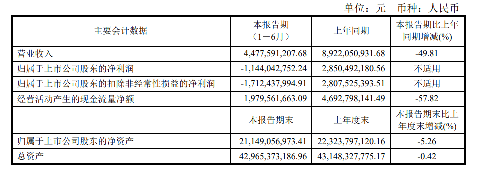 彩虹股份8月25日披露2022年半年度报告,该公司半年度实现营业收入44.78亿元,同比下降49.81%。归属于上市公司股东的净亏损11.44亿元,归属于上市公司股东的扣除非经常性损益的净亏损17.12亿元,同比由盈转亏。
