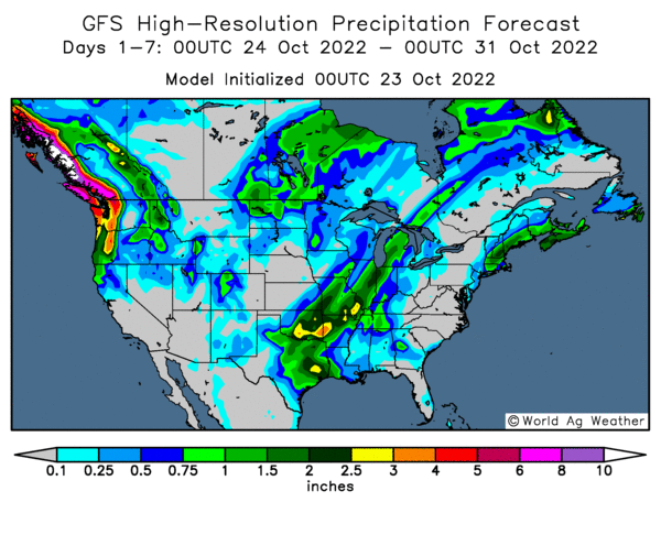 加拿大菜籽主产区,中部大部分地区均有降水,中部小范围降雨概率低,中南部广大地区降水量可达1英寸以上。