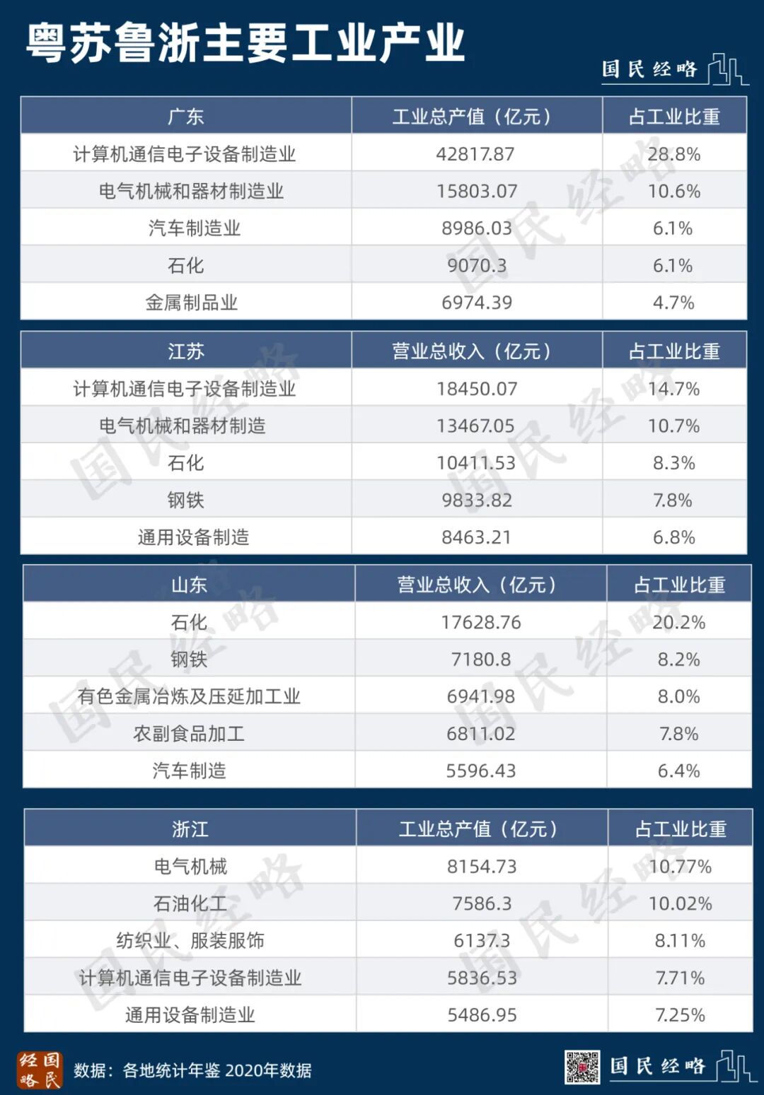 从产业结构来看,广东以电子、装备制造为主要支柱,而山东则以化工、钢铁、有色金属冶炼等主要支柱。