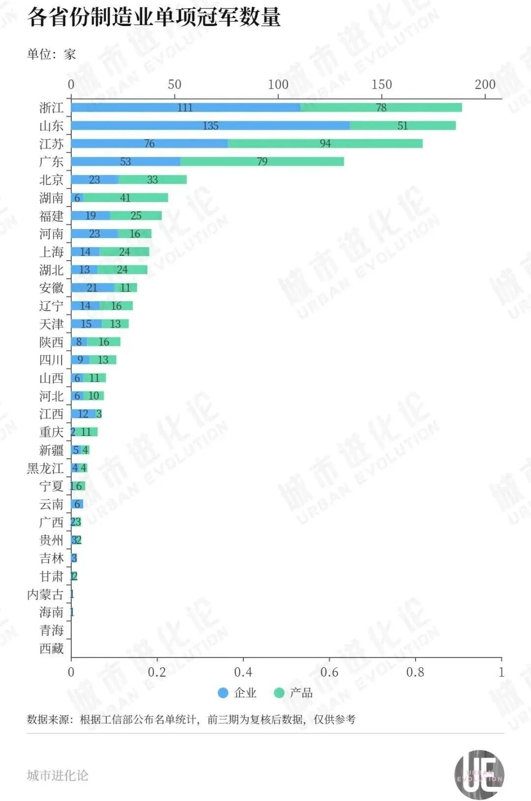 截至2022年,山东共有制造业单项冠军企业186家,仅次于浙江,超过广东、江苏,位居全国第二。
