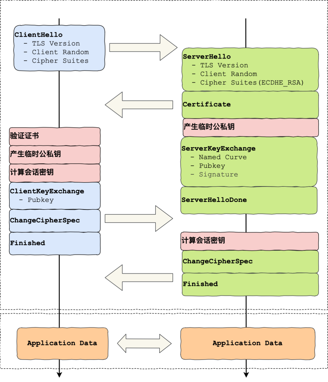 服务端收到后,选定一个椭圆曲线等参数,然后返回消息时,带上服务端这边的公钥。经过这 1 个 RTT,双方手上已经有生成会话密钥的材料了,于是客户端计算出会话密钥,就可以进行应用数据的加密传输了。