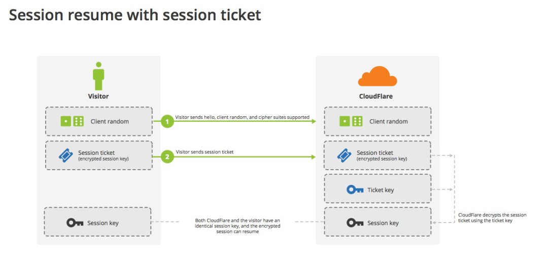 客户端再次连接服务器时,客户端会发送 Ticket,服务器解密后就可以获取上一次的会话密钥,然后验证有效期,如果没问题,就可以恢复会话了,开始加密通信。
