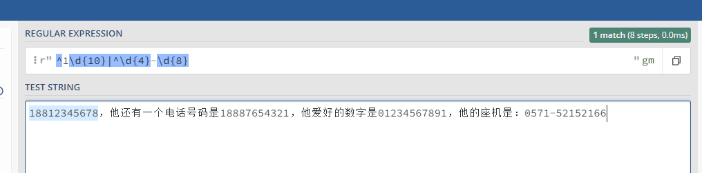 test_str = "18812345678,他还有一个电话号码是18887654321,他爱好的数字是01234567891,他的座机是:0571-52152166"