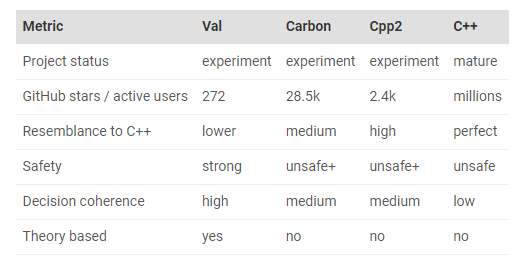 这三种语言也在它们与 C++ 的相似程度方面有所区别。正如所料,Cpp2 是三种语言中最接近 C++ 的。Carbon 似乎离 C++ 更远,但使用了与 C++ 相同的基本构件块;在 Carbon 中,用户的思考方式与他们在 C++ 中的方式基本相同。由于可变值语义,Val 程序员在编程时需要有一个稍微不同的思维模型,这可能使 Val 成为一种离 C++ 更远的语言。另一方面,如果我们看一下 Val 的快速定义口号,特别是在默认安全和简单的背景下,该语言的原则似乎可以很好地转化为 C++ 的受众。