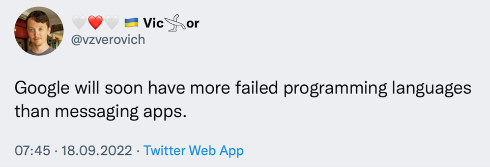 Lucian Radu Teodorescu 表示在他以前工作的一家公司,有一句口头禅是 "我们从不让项目失败"。谷歌和 Carbon 项目的文化中是否有一个类似的目标?人们似乎把谷歌看作是一家尝试许多产品并在一段时间后关闭它们的公司。例如,如下图,Victor Zverovich 的一条推特,他利用这种看法开了一个关于 Carbon 的玩笑。考虑到 Chandler 还宣布谷歌有一个不同的团队有同样的目标,但他们从 Rus t开始,转向 C++ 后,这种思路可能并不太牵强。