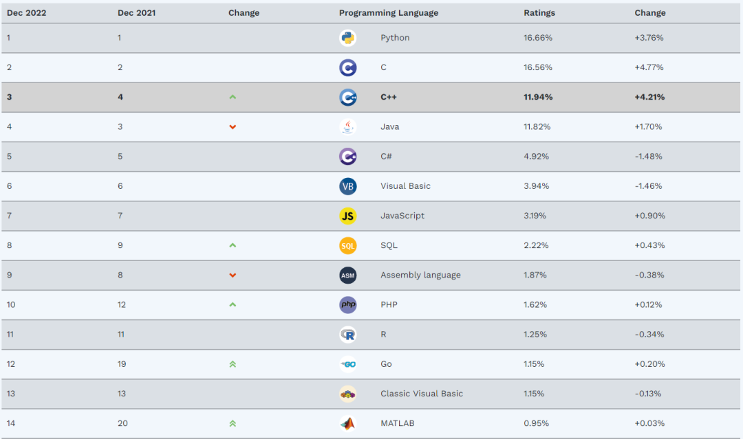 C++ 是一种特殊的编程语言,也是最常用的编程语言之一,但它也是最受批评的语言之一。根据 TIOBE 指数,30 年来,C++ 一直是排名前 4 的编程语言(使用12个月的平均值),并且还成功摘得了 2022 年的年度编程语言称号。