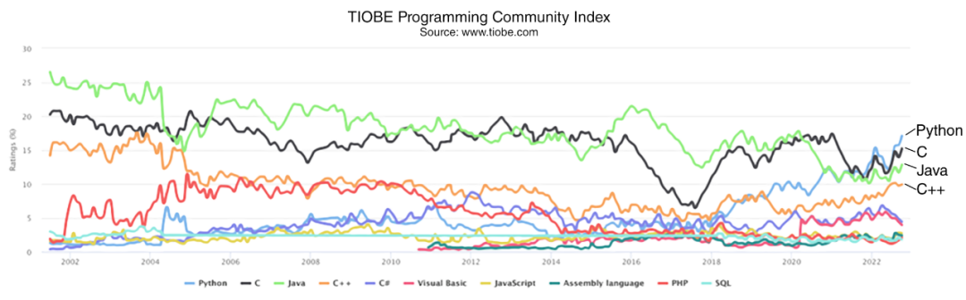参见下图,可了解过去 20 年的语言趋势(2022年10月的TIOBE编程社区指数)。
