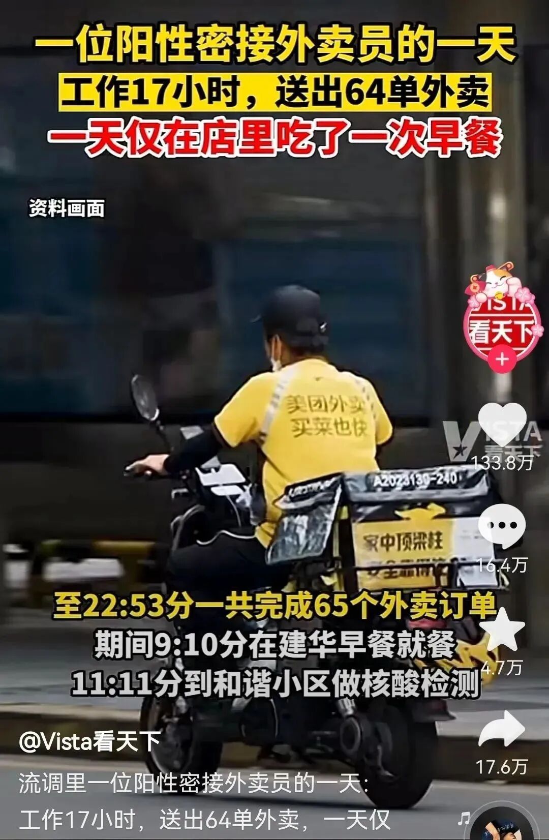 披星戴月,一天17个小时,外卖小哥一共送出了65单。