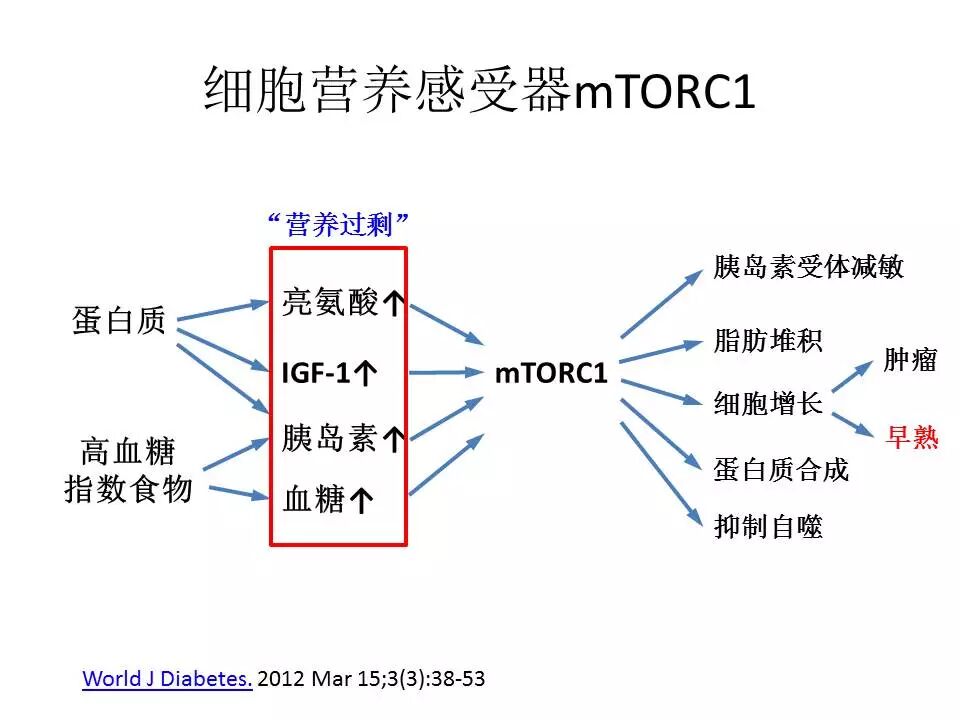 高IGF-1、胰岛素、氨基酸和葡萄糖的水平传递给细胞一个“营养过剩”的信号,最终导致过度生长和过早发育。