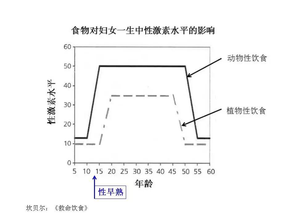 在《救命饮食》一书中,坎贝尔博士讨论了动物性饮食对女人一生雌激素水平的影响。动物性饮食的特点是高脂0纤高胆固醇。
