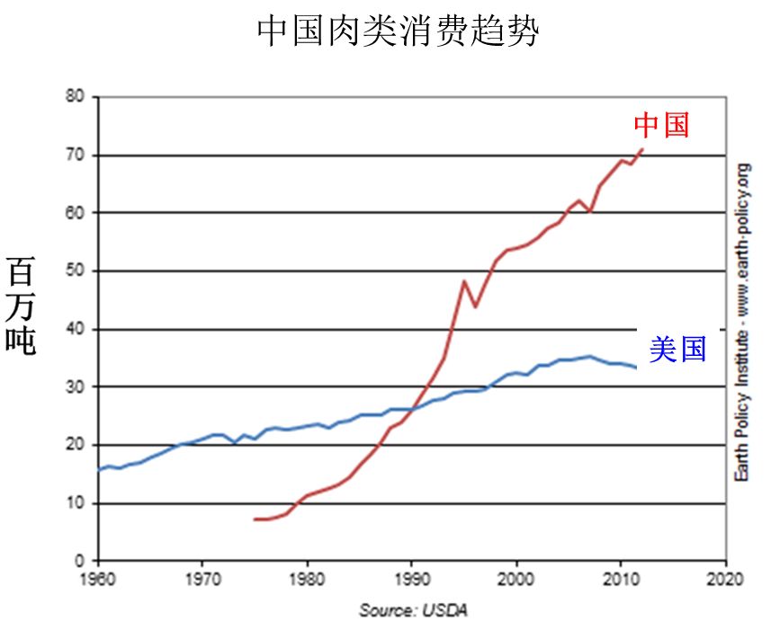 自70年代末开始,中国的肉类消费猛增了十几倍,从每年700万吨,猛增到每年8600万吨。