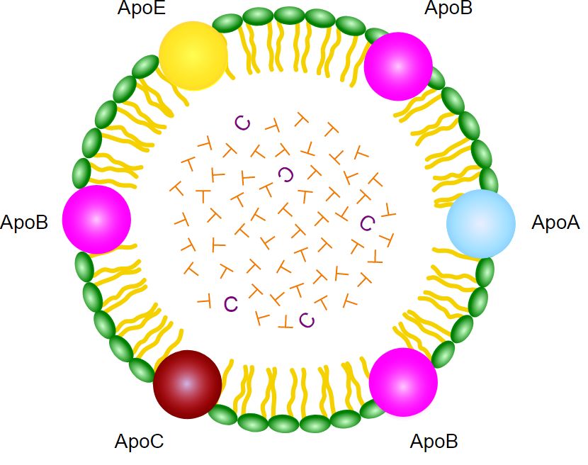 胆固醇(C)、甘油三酯(T)等亲脂物质不能直接在血液里运输。需要和脂蛋白(Apo)一起形成包裹体才能被血液运送到身体的其他部位。