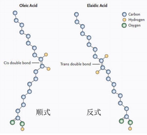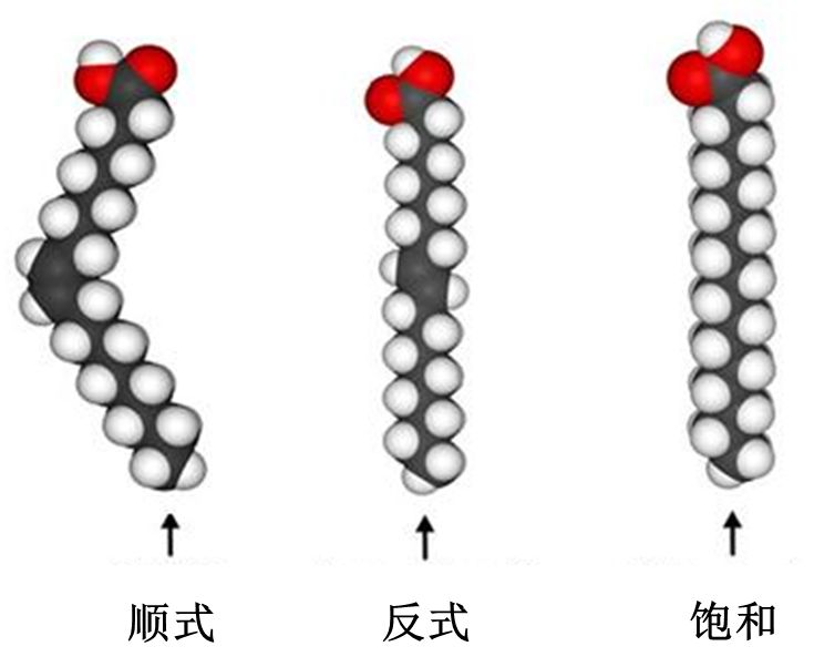 在顺式脂肪酸中,不饱和双键两侧的碳链分布在氢键的同一侧;在反式脂肪酸中,它们处于相对的两侧。