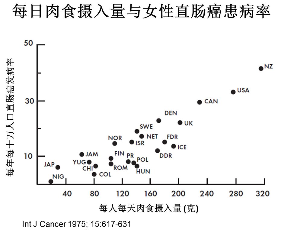 早在上世纪70年代,Amstrong在研究每个国家直肠癌发病率时,把这些数据和各个国家的肉类消费量作了一个对照。