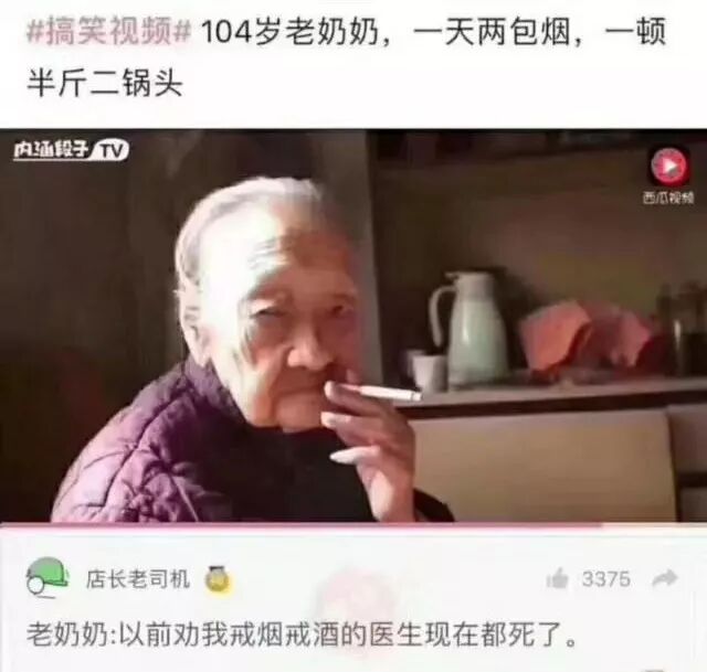 还有报道说,一位老人的长寿秘诀是每天吃一碗红烧肉。其实这并不奇怪,还有人天天抽烟也活了90几岁呢!