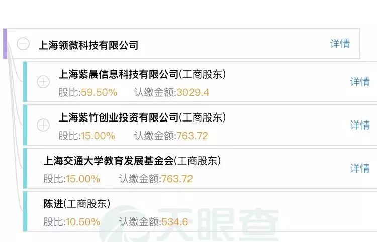 据新京报4月21日报道,陈进目前是上海领微的微一一名自然人股东,持股比例为10.5%,该公司大股东为上海紫晨信息科技有限公司持股59.5%,上海紫竹创业投资有限公司和上海交通大学教育发展基金会各持股15%。