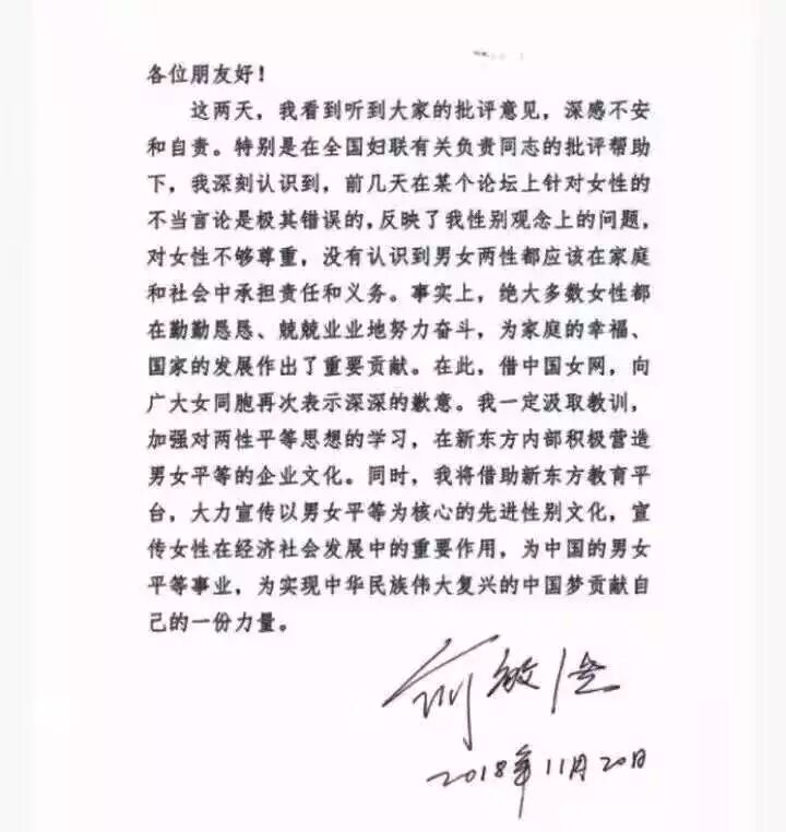 所以,俞敏洪无论怎样解释道歉也无济于事,最后直至给全国妇联写检查,深刻检讨自己要好好学习两性平等关系。