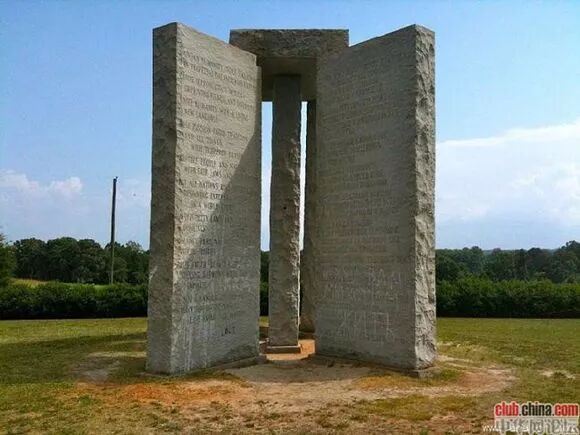 这座巨型石碑建立于1980年,是共济会的纲领性目标,最核心的内容是:把地球人口控制在五亿以下,实行统一语言,建立世界联合政府。