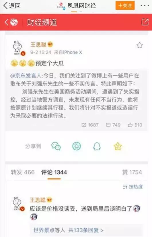9月2日,针对京东的声明,前首富公子王思聪在微博上“预定了一个大瓜”,并随后补充“价格没谈妥,送到局里谈明白了”,更使刘性侵丑闻迅速发酵。