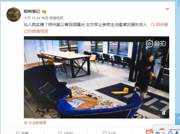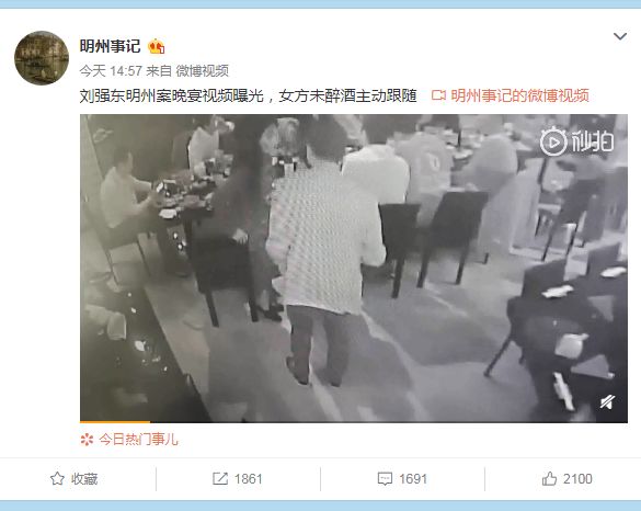 没想到,就在今天,一位叫“明州事记”的网友在微博曝光了两段视频,一段视频显示晚宴后女方未醉酒,主动跟随;一段显示女方举止亲密举动邀请刘强东进入公寓。