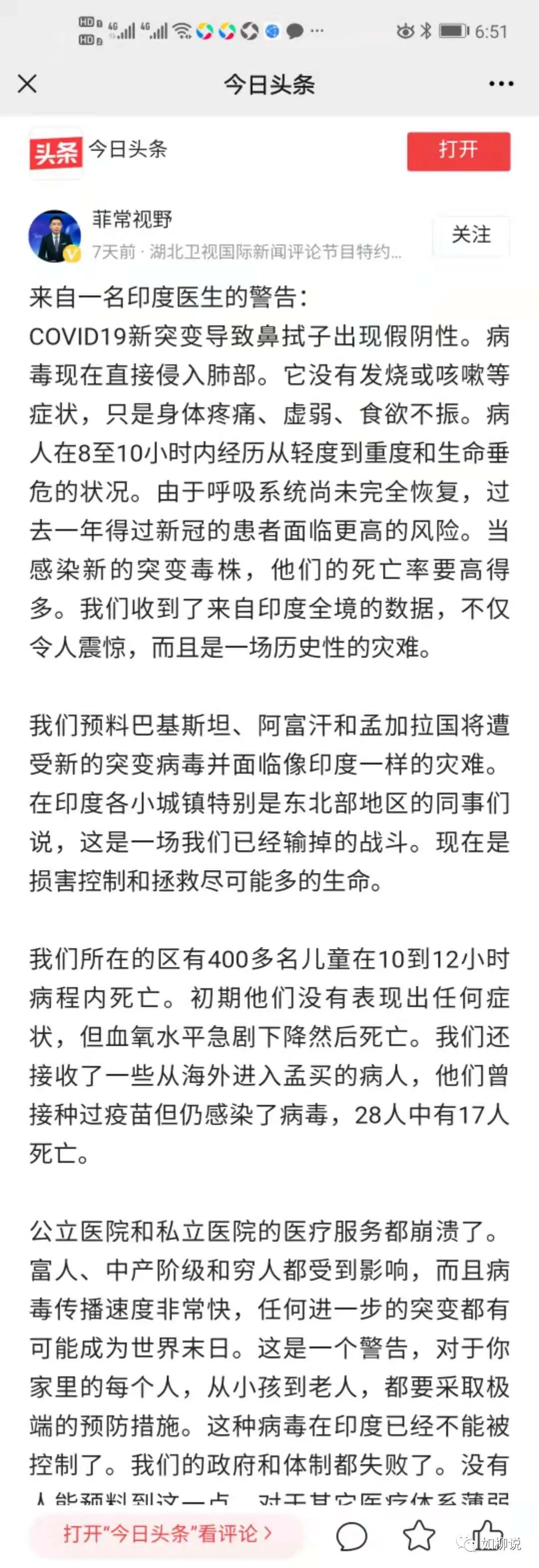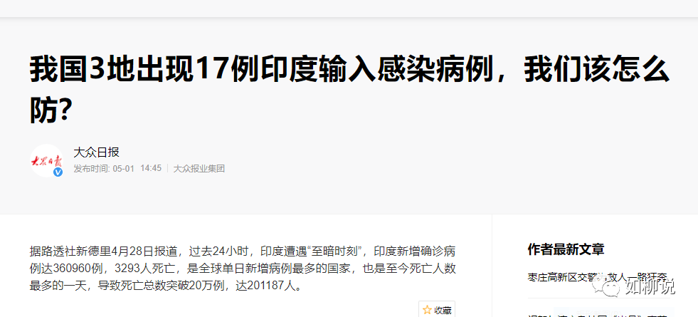 所以,如柳今天必须呼吁,国家应该立即限制印度人或最近两个月内在印度逗留过的人入境(中国公民除外,但是隔离期至少要一个月,而不是14天,上文那名在中国确诊的印度籍人士就是结束14天隔离期后确诊的)。这里所说的限制入境,不仅仅是与印度断航,而是限制所有印度人及近期到过印度的人入境(这名印度籍人士就是通过周转其它国家入境上海的),否则,我们的抗疫成果将毁于一旦,如果印度变异毒株在中国扩散,未来将不堪设想,因为过去的抗疫模式根本对付不了印度变异毒株,包括中医药预防治疗措施都具有不确定性,因为变异毒株病程太短、病情恶化太严重。![]()