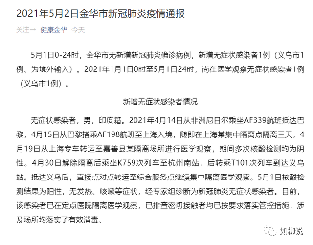 更加可怕的是,5月2日,媒体报道,一位从上海入境的印度人在解除隔离后在浙江金华确诊阳性,确诊前,4月30日,他曾乘坐过两列火车,到过杭州和义乌市。而他确诊前乘坐火车周转时,正是人流密集的五一假期,现在的印度变异毒株比以往的新冠病毒恐怖百倍,传染率致死率高得多,而且病程短,可致免疫逃逸,不论从哪一个方面来说,这个五一期间曾经在中国多地乘坐火车的印度籍确诊者,将会在中国埋下印度变异毒株在中国扩散的定时炸弹。![]()