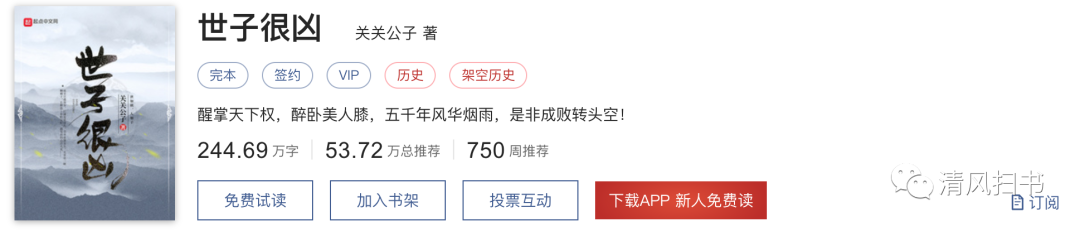 言而总之,《世子很凶》虽然是一本颇有生趣的佳作,但并不是我心目当中的神作。当然一千个人眼中有一千个哈姆雷特,对书的理解是一件相当主观的事,清风也是基于自己的感受提出一个角度,也希望诸位能够从这篇文章当中有所收获。