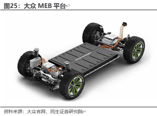 打造三大纯电平台,奠定转型基础。大众为顺利推进其电动化转型,打造了MEB、PPE、SPE三大纯电平台,分别对标其MQB、MLB、MSB三大传统乘用车平台,其中MEB仍将面向大众、斯柯达、西雅特等经济型品牌,已于2019开启运作,平台主打车型包括ID系列、奥迪Q4 e-tron等;PPE则面向奥迪、兰博基尼、保时捷等高端品牌,在车辆运动性、电性能方面有突出优势,已于2022年投产,主要车型为奥迪A6 e-tron;SPE面向宾利、布加迪等顶级奢华品牌,首款车型将于2025推出。