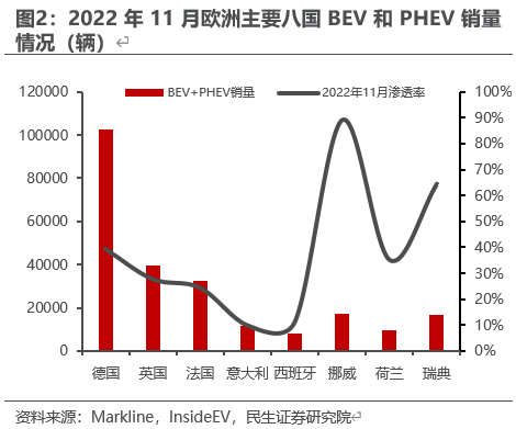 11月欧洲八国新能车销量及渗透率实现环比增长。尽管欧洲各国新能车激励政策已接近尾声,但终端需求已由政策驱动转型为市场驱动,同时俄乌冲突使得燃油价格居高不下,诸多利好因素作用下,预计车市电动化进程仍将稳健前行,整体维持同比及渗透率的稳步增长,但受季节因素扰动,环比或增降不一。德国新能车销量继续领跑欧洲,实现单月销量10.26万辆。新能车销量方面,除意大利和荷兰分别同比下降6.17%和10.41%,其余国家均实现同比增长,其中德国同比增幅最大,达50.45%;受年末高销量效应的积极影响,八国环比均实现增长,其中德国和挪威环增显著,分别达51.40%和60.48%。从新能车渗透率来看,11月八国渗透率同比增减不一,德国、法国、西班牙、瑞典渗透率均增长,其中瑞典渗透率同比提升10.3 Pcts,其余四国渗透率同比下降。环比方面,八国渗透率均实现增长。新能车高渗透三国中,挪威渗透率达89.26%,瑞典渗透率达64.55%,荷兰渗透率达35.14%