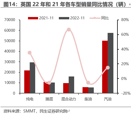 英国:新能车销量同环双增,渗透率环比提升。乘用车总销量方面,11月乘用车单月销量达14.29万辆,同比增长23.49%,环比增长6.36%。新能车方面,11月单月销量达3.96万辆,同比增长21.63%,环比增长37.2%。其中,EV销量2.94万辆,同比增长35.19%,环比增长47.35%;PHEV销量达1.02万辆,同比下降5.65%,环比增长14.46%。1-11月整体乘用车累计销量为148.56万辆,同比下降3.44%,新能车累计销量为31.8万辆,同比上升18.11%。动力系统占比方面,与10月相比,纯电和插混占比提升。11月,纯电市占比20.56%,较10月上升5.72 Pcts;插混占比7.13%,较10月提升0.5 Pcts;纯电+插电混动11月合计市占比达27.68%,较10月上升6.22 Pcts,较去年同期下降2.92 Pcts,渗透率实现环比提升。