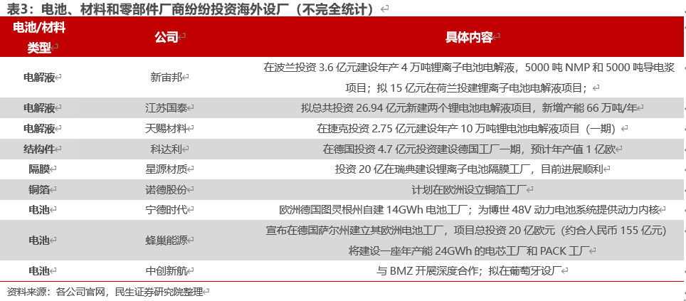 中国锂电产业链持续走出去。新能源汽车的需求增速加快,下游车企对上游供应商的供货渠道、产品质量稳定性要求不断提升,全球新能源汽车市场正在逐步形成“车企——电池——材料——资源”强强联合的稳定供应体系。随着以欧洲为首的新能源车市场异军突起,中国锂电产业链具备全球竞争力的电池材料厂商将持续受益。