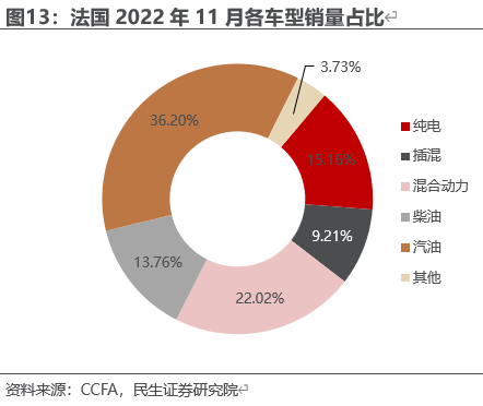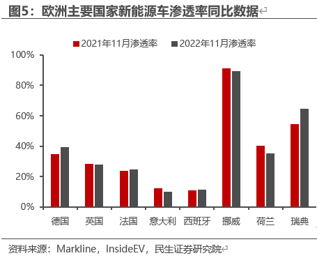 新能车整体渗透率增长态势持续,欧洲八国渗透率整体同比增长2 Pcts。2022年11月欧洲八国新能车渗透率同比增减不一,渗透率环比均实现增长。同比方面,德国、法国、西班牙、瑞典渗透率分别增长5、0.9、0.3、10.3 Pcts,其余均下降;环比方面,德国、英国、瑞典渗透率增长较为显著,分别增长了6.9、6.22、5.14 Pcts。