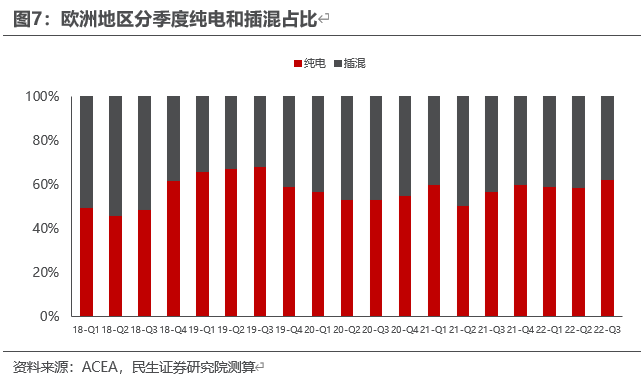 分车型上看,11月欧洲纯电和插混均实现销量同环双增,Q3纯电占比超60%。销量方面,11月,欧洲纯电销量达17.84万辆,同比增长32.87%,环比增长45.61%;插电混动销量达10.53万辆,同比增长22.17%,环比增长23.28%。占比方面,11月纯电占比达62.87%,相较10月上升3.96 Pcts;插混占比达37.13%。22Q3,纯电销量为34.7万辆,插混为20.8万辆,纯电百分比为62.52%,较Q2的58.88%有所上升。