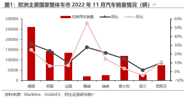供应链外部干扰因素仍在,但在年末销量冲量作用下,11月欧洲乘用车销量实现同环双增。欧洲虽然仍处于疫情、俄乌冲突、能源危机、高通胀的多重影响中,但因接近年末,11月乘用车整体销量实现同环双增。11月,德国、英国、法国、挪威、瑞典、意大利、荷兰、西班牙八个主要市场整体乘用车销量分别达到26.05、14.29、13.40、1.95、2.56、11.99、2.78、7.32万辆,八国合计达80.33万辆,同比上升19.81%,环比上升12.56%;欧洲八国乘用车销量同比均有所上升;环比除荷兰外其余均环比上升;八国1-11月累计销量为781.69万辆,同比下降7.31%。11月接近年末,在年末销量冲量作用下呈现环比高增长,符合预期,预计12月销量将再攀新高。