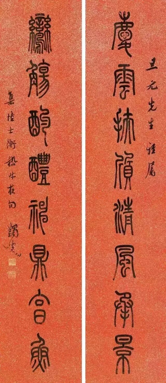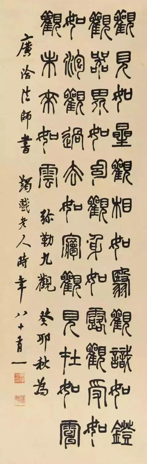 马一浮先生书法融章草、汉隶于一体,格调高古,气势雄强,面目独特,自成一家,给人以高山仰止之叹。尤其马一浮先生书法有一个特点,那就是头大势雄,斜上取势,高耸峻拔,有高山坠石之危势,且笔画平易简洁,并不故作姿态,虎踞龙盘,不怒自威,尤其行楷对联,中堂一挂,压得人喘不过气来。